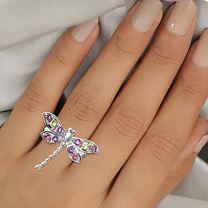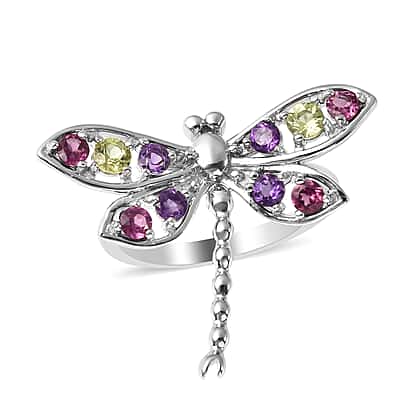 Lucy Q Dragonfly Collection - 0.85 Ct. Rhodolite Garnet, Peridot and Amethyst Dragonfly Ring in Rhodium Plated Sterling Silver