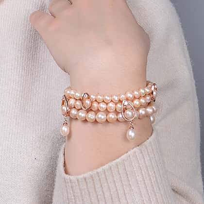 Lucy Q 245.55 Ct. Pink Freshwater Pearl and Natural Cambodian Zircon Three Layer Bracelet Size 7.5 in Rose Gold Plated Sterling Silver