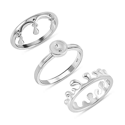 Set of 3 - Lucy Q Ocean, Button and Triple Drip Ring in Rhodium Plated Sterling Silver, Silver Wt 7.50 Gms.