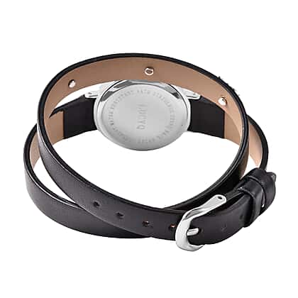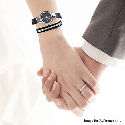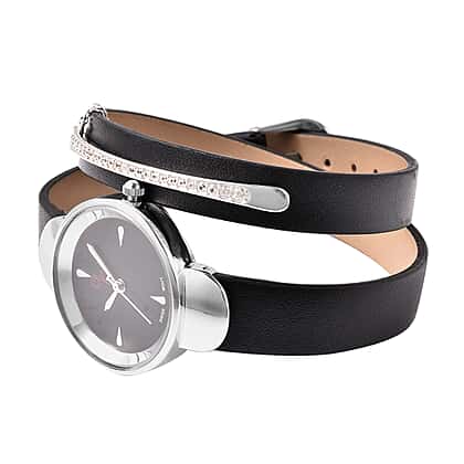 LUCYQ Swiss Movement Black Dial 3ATM Water Resistant Watch with 3 Row Black Leather Strap and Natural Cambodian Zircon Studded Sterling Silver Charm in a Gift Box