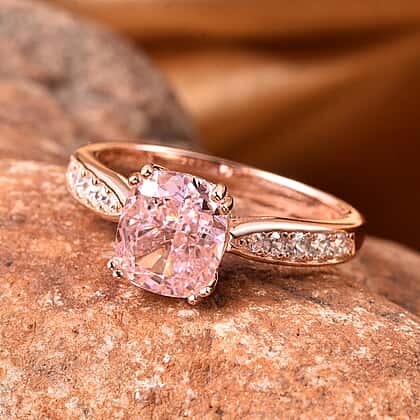 • STONE DETAILS: Through double prong setting, round faceted cut and cushion faceted cut Simulated Pink Diamond has been studded onto this ring