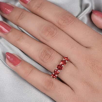 - STONE DETAILS: Five round cut and faceted Scarlet Swarovski Crystals weighing 1.5 carats sit at the front of the ring in a raised shared prong setting