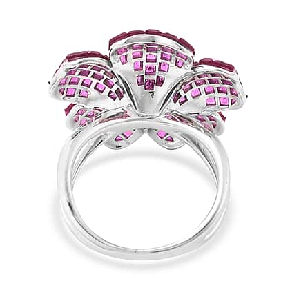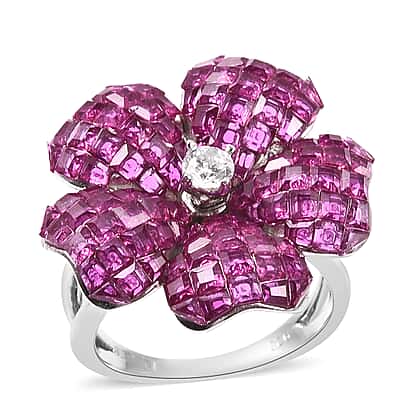 Lustro Stella Simulated Ruby and Simulated Diamond Floral Ring in Rhodium Overlay Sterling Silver