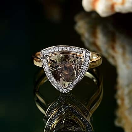 Choose a certified creation designed for collectors who value assured authenticity. This LUXORO ring showcases a rare 4.15 ct AAA Turkizite, a gemstone known for a natural colour-shift effect that cannot be found easily in nature. AAA Turkizite is rare due to its naturally shifting tone that is not easily found. Designed in a striking shield design, the stone moves gently in tone as light meets its facets, giving the design a subtle, ever-changing glow. The captivating halo of white diamonds encircling the Centerstone offers shine and sparkle. Expertly crafted in premium 14K yellow gold, this piece ensures durability and enduring shine with a luxurious finish. The carved gallery holds the stone securely and keeps the profile graceful. A standout design shaped for those drawn to certified quality and distinctive forms. A perfect piece for evening looks and giving a luxury to your special one for a lasting impression.