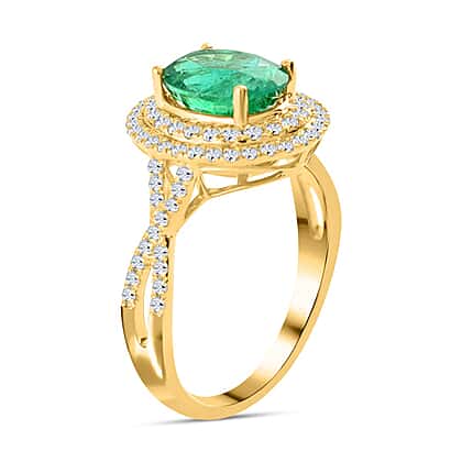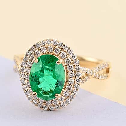LUXORO 14K Yellow Gold AAA Zambian Emerald, White Diamond I2 Double Halo Ring, 2.30 Ct.