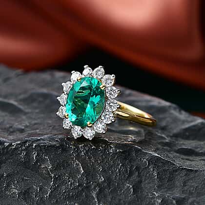 Luxuriant - AAA Lab Grown Columbian Emerald & SI-G-H Lab Grown Diamond Halo Ring in 18K Vermeil Yellow Gold Plated Sterling Silver 3.26 Ct.