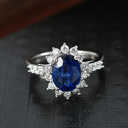 LUXURIANT 2.4 Ct. AAA Natural Kashmir Kyanite, Lab Grown Diamond Sunburst Ring in Rhodium Overlay Sterling Silver (SI-G-H)