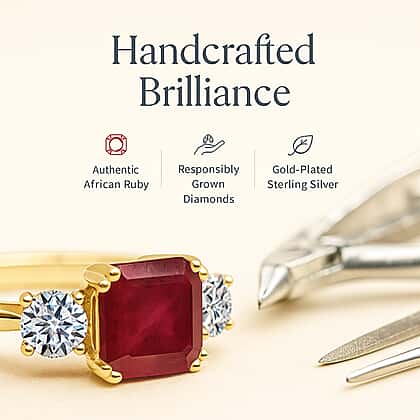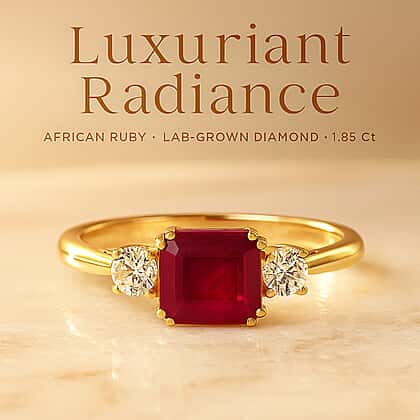 LUXURIANT 1.85 Ct. Natural African Ruby, Lab Grown Diamond Ring in Yellow Gold Plated Sterling Silver