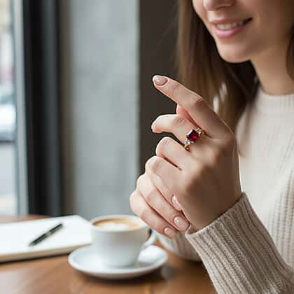 Get past wearing just a diamond ring for special occasions, when this Luxuriant natural African ruby and lab-grown ring makes for an equally stunner piece. It features an earth-mined red natural ruby, octagon-cut gemstone at the centre and is secured in a four-prong setting. On either side of the natural ruby centre piece lie two round-cut diamonds. All these gemstones are mounted on a smooth shank, which beautifully contrasts with the elaborate centre piece. Crafted in yellow plated sterling silver, this natural ruby and diamond ring makes for an investment-worthy, romantic piece that feels both traditional and unconventional.