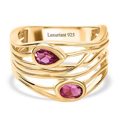 Uplift your fashion game with this exquisite ring, featuring a lab-grown Bixbite gemstone with polished gold-plated bands, creating a striking piece. The ring features a flowing filigree design with openwork detailing, creating a wave-like effect around your finger, making it a must-have ring for a classy look. Artfully made from hypoallergenic 925 sterling silver, this ring offers durability and comfort for sensitive skin. The luxurious 18K yellow gold plating on sterling silver offers a lustrous shine and a lavish finish. This ring showcases a perfect fusion of artistry and contemporary style that captures attention, making it suitable for everyday wear and special gifting to your loved ones.