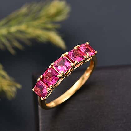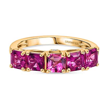Displaying an enchanting allure, this five-stone ring is a perfect reflection of class and sophistication. This five-stone ring features a row of lab-grown bixbite gemstones on yellow gold plating, creating a piece that exudes flawless shine. Lab-grown diamond enhances its beauty, lying within the under gallery, adding a touch of opulence. Crafted in 18K vermeil yellow gold plating over 925 sterling silver, this ring ensures durability and a warm tone finish. The hypoallergenic metal offers comfort and safety for sensitive skin. The ring shines with its glossy finish and bixbite sparkle, making it suitable for special gifting like engagement, anniversaries, birthdays, and personal styling.