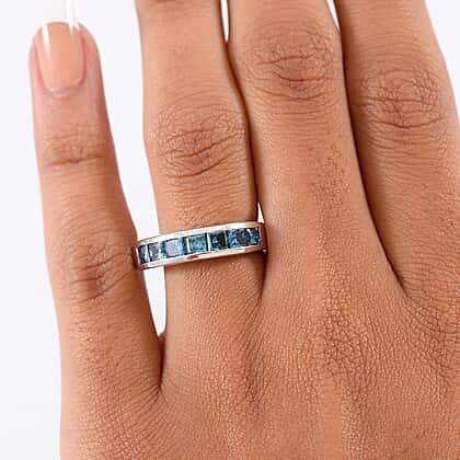 This fascinating band ring is adorned with a row of lab-grown blue diamonds, offering a touch of oceanic blue. The stones are arranged in a straight line, positioned closely together to create an even surface. Each stone is precisely cut in a square shape to align firmly edge-to-edge within the channel. Expertly crafted in hypoallergenic 925 sterling silver, this ring offers durability and comfort for sensitive skin. The glossy rhodium overlay provides a mirror-like shine and a smooth appearance. A band ring is perfect for everyday wear, solo or stacked. This blue lab-grown diamond band ring is ideal for adding a touch of oceanic beauty to your jewellery collection and meaningful gifting.
