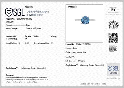 LUXURIANT 1 Ct. Lab Grown Blue Diamond Solitaire Ring in Rhodium Overlay Sterling Silver, SGL Certified