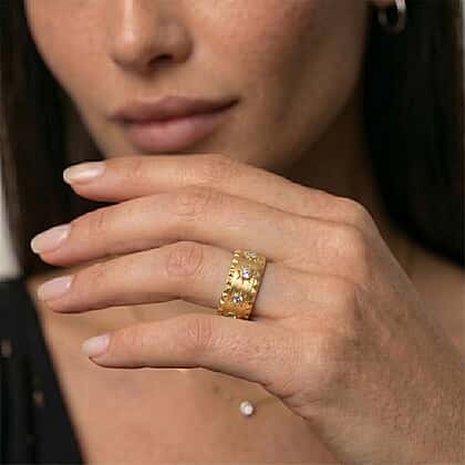 Add spark to your outfit with this band ring featuring lab-grown diamonds in precision-cut star frames, catching and reflecting light with radiant brilliance. The wide design exudes contemporary strength and artistry, blending bold golden presence with refined luxury. Meticulously crafted in 18K vermeil yellow gold, this ring offers luxurious appeal and luminous warm tone shine. Made in hypoallergenic 925 sterling silver, this provides durability and comfort to sensitive skin. This is a standout piece that elevates both relaxed dressing and refined evening style. Also, perfect for special luxurious gifting and styling on special occasions.