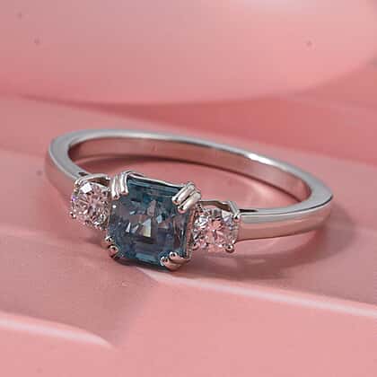 LUXURIANT Lab Grown Diamond, Blue Zircon Three-Stone Emerald-Cut Ring in Rhodium Overlay Sterling Silver 1.61 Ct.