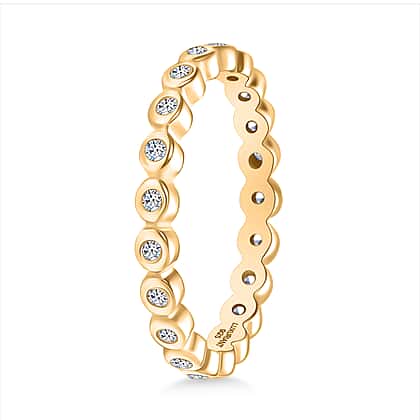 Displaying a classic line full eternity band ring with a soft contemporary edge from Luxuriant, featuring a row of lab-grown diamonds. The complete eternity design symbolises a never-ending circle of love, creating a meaningful piece. Carefully set in radiant 18K yellow gold vermeil on 925 sterling silver, this ring offers durability and lavish shine. The metal's hypoallergenic properties make the piece safe for sensitive skin. Each stone is securely bezel-set, giving a beautifully smooth finish that sits comfortably against the skin while offering a continuous sparkle ribbon across the finger. A beautifully versatile style that pairs well with both solitaire and stacking bands. This is an ideal piece for special occasions and for gifting to your special one, leaving a lasting impression.