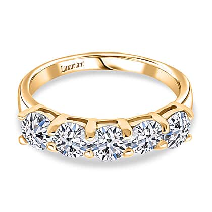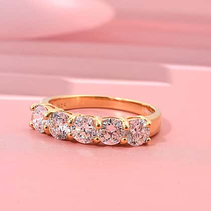 A five-stone ring makes for an instant keepsake, especially when it's adorned with diamonds. Like this Luxuriant Lab Grown Diamond ring that features five round-cut diamonds mounted on a smooth band. Crafted in yellow gold-plated sterling silver, this ring can represent a couple's past, present, and future. This ring feels opulent and the contrast between the warm hue of the band and diamond makes it really stand out. This five-stone ring also makes for a great fifth anniversary gift and can make an elegant addition to any jewellery collection.