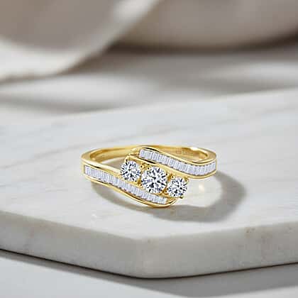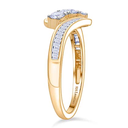 If you are someone who wants to steer clear of conventional pieces, then look no further than this Luxuriant lab-grown diamond ring. It features The ]three round-cut diamonds at the centre, symbolising past, present, and future of a couple's relationship. This three-stone ring is beautifully framed by sleek rows of baguette-cut stones. Crafted in a fluid, wave-like silhouette, the ring combines movement and precision, creating a look that’s both graceful and contemporary. Made in yellow gold plated sterling silver, this ring has a floaty feel.