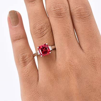 A statement of refinement, this luxuriant diamond ring features a striking lab-grown padparadscha sapphire in an orange-pink hue, lying at the heart of the piece. The centrestone is complemented by two lab-grown diamonds on both sides, adding extra brilliance and shine to the ring. Meticulously crafted in rhodium overlay on 925 sterling silver, this ring ensures durability and lasting shine. The hypoallergenic nature of the metal makes the piece safe and secure for sensitive skin. Ideal for dazzling gifts and special treats for yourself, this design is also perfect for anniversaries, engagements, or celebrating any festival.