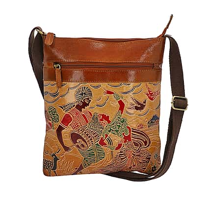 Madhubani Art Pattern Crossbody Bag with Adjustable Shoulder Strap (Size 26x29 Cm) - Tan