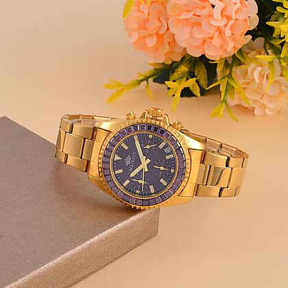 MAJESTY Multi Function Chronograph Movt. Purple Cubic Zirconia Studded Water Resistant 38mm Watch with Stainless steel Chain Strap in Gold Tone