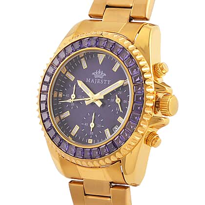 MAJESTY Limited Edition Multi-Function Purple CZ Purple Dial 3 ATM Water Resistant Watch in Gold Tone With Gift Box