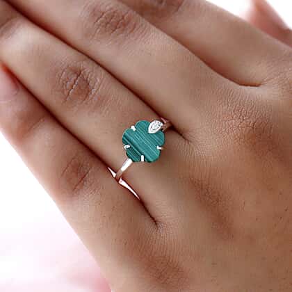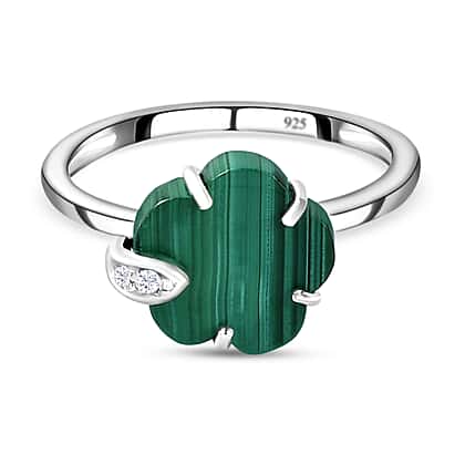 Malachite and Natural Cambodian Zircon Floral Ring in Sterling Silver 3.84 Ct.