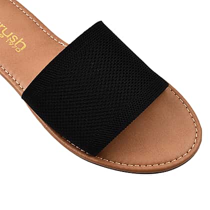 The pair's synthetic leather texture is vegan-friendly, allowing them to stay active for years to come. The black broad strap contributes to the overall look. These slippers have a gorgeous design on the straps and subtle texturing, making them a wardrobe must-have. The slippers have a front open toe and are fashioned in a comfortable way. These slip-on slippers can spice up any outfit in a matter of seconds. Because the sandals have a flat heel, you can wear them to work or the store on a regular basis.