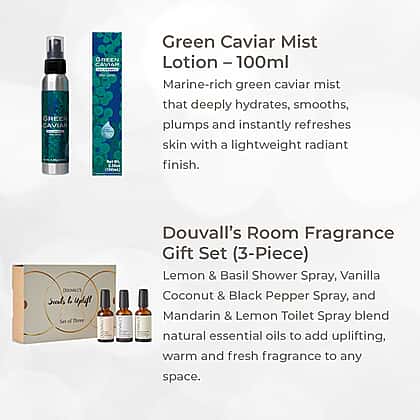 Introducing Magic beauty gift box - the ultimate radiance bundle, curated to give you the small luxuries you rarely pause to enjoy. A perfect blend of self-care with everyday luxury, this box gathers skincare, fragrance and beauty care in one set. Inside, you’ll find the hydrating Green Caviar Mist Lotion, three uplifting Douvall’s room sprays, a retractable Neomi detangling brush, the rich Eternal Night extrait de perfume, and the vibrant Laurelle Crimson Bloom mist. The gold cryosculptor tool helps refresh tired skin, while Douvall’s argan shampoo leaves hair soft and nourished. To make it even better, the box includes a surprise Escada phone holder for a little extra joy.