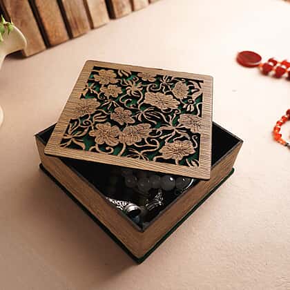 A woman’s friend in need, this handcrafted jewellery box is made of medium-density fibreboard (MDF). The fibreboard makes it durable but lightweight, and eco-friendly. The inside of the box is lined with green velvet that prevents your favourite jewels from getting scratch marks and abrasions. The cover showcases a handmade floral pattern that comes alive with green velvet on the inside. The square-shaped box is ideal for storing your rings and bangles.