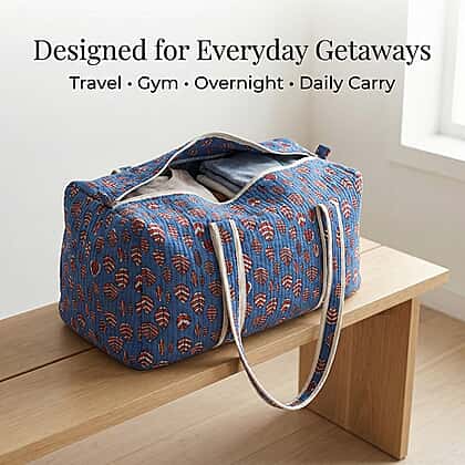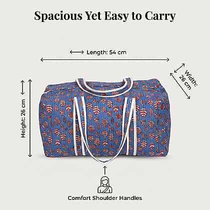Travel smart and stylish with this Blue Cotton Quilted Travel Bag, perfect for weekend trips, gym sessions, or short getaways. Made from high-quality quilted cotton, it combines a soft textured finish with dependable durability. The spacious 60 x 32 x 32 cm interior easily holds clothing, toiletries, and more. Designed with comfort in mind, the 31 cm high, 5 cm wide handles make it easy to carry by hand or over the shoulder. A strong zipper closure keeps your items secure. Featuring a playful red and white leaf print, this bag adds a fun and fashionable twist to your travel gear.