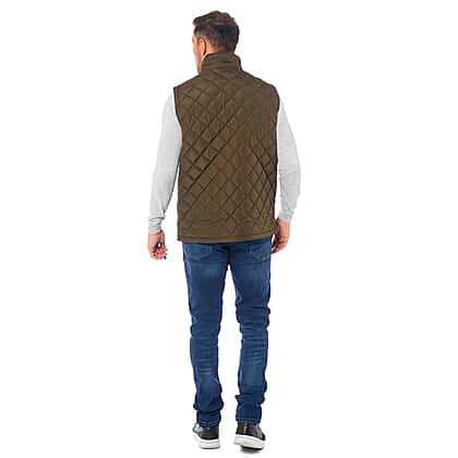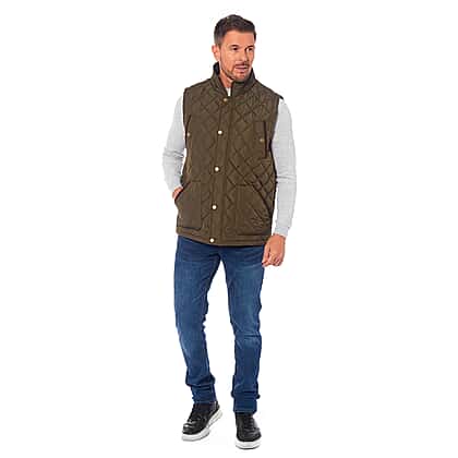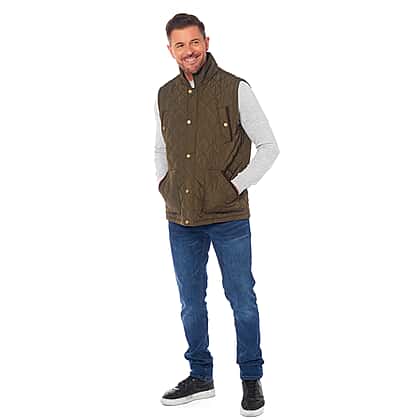 Introduce a versatile layer to your wardrobe with this Men's Padded Gilet in a sophisticated olive shade. Constructed entirely from polyester, this gilet guarantees both comfort and lasting quality. It's detailed with refined corduroy trim on the inside neck and pockets, offering an elevated look. This sleeveless gilet is perfect for layering during the cooler months, providing warmth without bulk. Secured with both a chain and button closure, it ensures a secure fit while offering easy accessibility. Additionally, it is equipped with four front pockets, blending practicality with style.