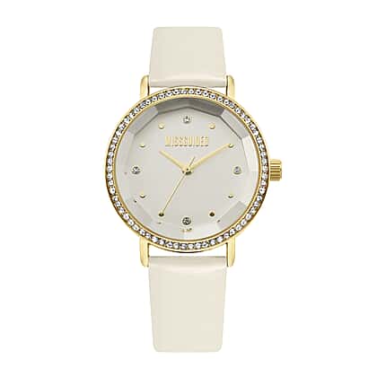 MISSGUIDED Watch with Gold Case, Stone Set Bezel, Round White Dial and White Strap