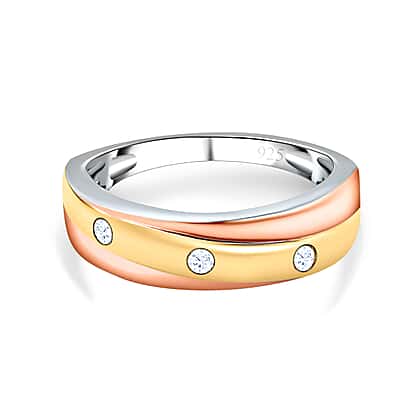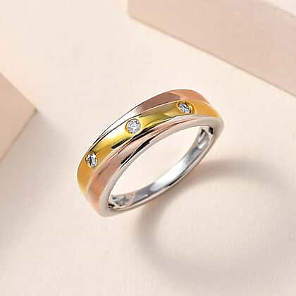Moissanite 3 Stone Wedding Band Ring in Three Tone Plated Sterling Silver