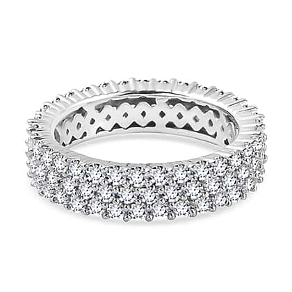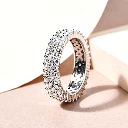You're sure to turn heads this season with this Full Eternity Moissanite Band Ring in Platinum Plated Sterling Silver. A Full eternity pattern has been created on this ring by prong setting a number of round faceted cut Moissanite. The long-lasting item features a slender shank with a sturdy head that retains all of the Diamonds in place. A total of 105 Moissanites has been studded onto this sparkling piece of jewellery