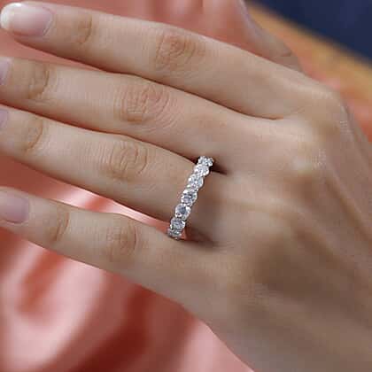 This moissanite eternity band ring will embrace you in its charm with its unique symbolic design and timeless beauty! Eternity bands are a symbol of love and promise that lasts forever. The moissanite gemstones are studded along the band in a trellis setting, adding eye-catching detail. Trellis setting features swooping and interlacing prongs that hold the gemstones perfectly. Moissanite offers brilliant sparkles with intense fire and clarity. Designed with care using sterling silver, the ring has a platinum overlay that protects against tarnishes and corrosion. An elegant and timeless piece, this will be your favourite in your precious collection.