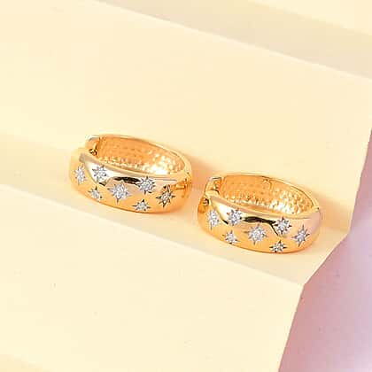 Giving a touch of glamour and sparkles to the classic full hoop design, they have a 18K vermeil yellow gold overlay on the sterling silver make. These earrings are lightweight and comfortable to wear all day long with a clasp fastening. The unique starry pattern, embedded with moissanites, gives these earrings an embossed effect over the yellow gold hoops. Are you ready for the spotlight?