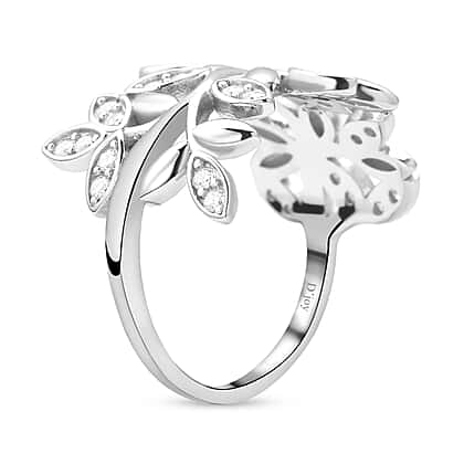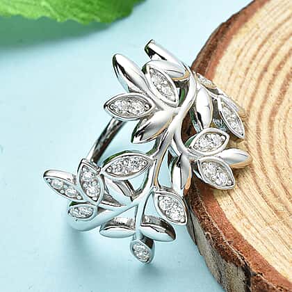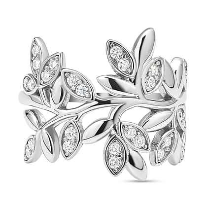 Moissanite Leaf Vine Ring in Rhodium Overlay Sterling Silver