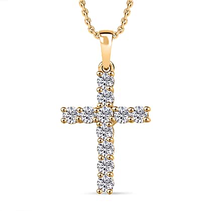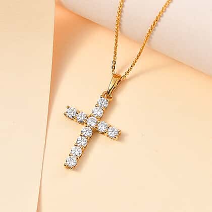 This scintillating moissanite pendant blends the divine and contemporary, with its cross design. Eleven brilliant moissanite rounds, each prong-set to perfection, create a dazzling cascade of light that sparkles with every movement. The vermeil yellow gold overlay on sterling silver infuses the piece with a radiant sheen, enveloping it in a princely elegance. The pendant’s 3 cm drop is perfectly poised to complement any neckline with effortless grace.