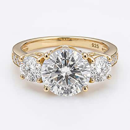 What if we told you that the celebratory sparkle of a diamond ring is available at a fraction of the price! This moissanite ring featuring a trilogy theme is up for grabs on the TJC. Crafted in sterling silver and glazed with the polished sheen of 14K yellow gold overlay, the moissanite ring matches the brilliance of a diamond ring. Prong-set stones offer a dazzling radiance.