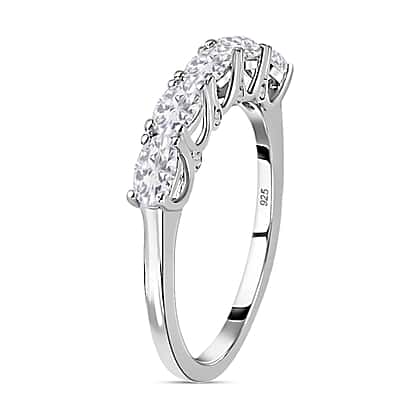 - 5-stone ring made with round, faceted moissanites