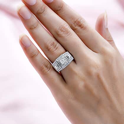 Wear this stylish and glamorous moissanite ring and elevate the look of your jewellery collection. This ring is crafted from 925 sterling silver with a platinum overlay to give it a bright sparkle and shine. This broad ring is studded with vivid shapes and sizes of moissanite, secured in a prong setting, giving out brilliant sparkle and shine. You can adorn this divine and fascinating ring on your big day or pair it on your dinner date to glam-up the look.