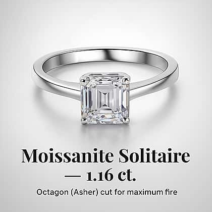 Elegant and unfussy ring styles stand the test of time. Like this Moissanite Solitaire Ring that features clean lines, simple setting, and a sparkling gemstone at the centre. This solitaire design helps the octagon-cut moissanite at the heart take the centre stage. It offers a bold and statement-making look to the ring as it features a lot of facets which helps to enhance the fire and brilliance of the ring. Crafted in platinum overlay sterling silver, this ring features a smooth shank. This makes for a timeless piece that will look great on anyone! It also uses a sense of balance and proportion ,which makes it look alluring.