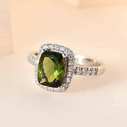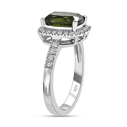Moldavite & Natural Zircon Ring in Platinum Overlay Sterling Silver 2.29 Ct.