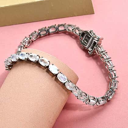 Mirroring a gentle moonlike glow, this elegant bracelet makes an elegant, all-occasion piece of jewellery. The moon glow stone and diamond bracelet is forged in 9.27 grams of sterling silver overlaid with platinum and studded with 27 oval moon glow stones weighing 12.25 Carat. The tennis bracelet is also studded with white diamonds that adorn its open box clasp. Wear it with your favourite outfit to radiate regal charm.