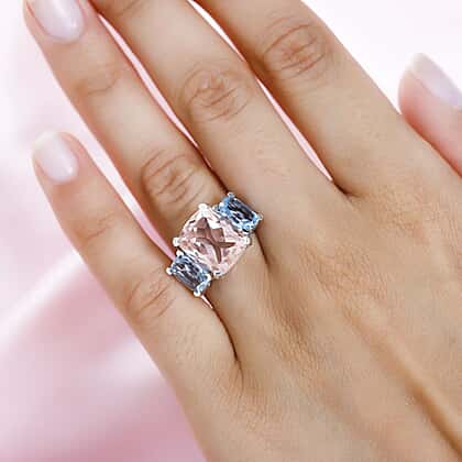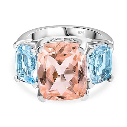 Morganite Color Quartz & Skyblue Topaz 3 Stone Ring in Platinum Overlay Sterling Silver 10.10 Ct