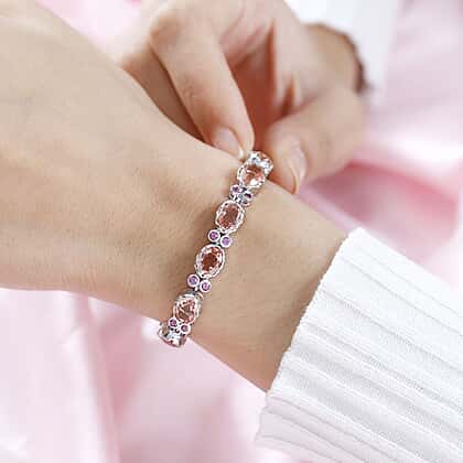 Designed for the modern woman who embraces both versatility and confidence, this exquisite Morganite Triplet Quartz and Lotus Garnet Cluster Bracelet is a testament to sophisticated accessorising. Crafted from fine white silver with a luxurious platinum overlay, this bracelet shines with a rich sheen that catches the eye. The faceted Morganite Quartz ovals, each measuring 8x6mm, are elegantly arranged in a station style, providing a subtle yet impactful presence on the wrist.