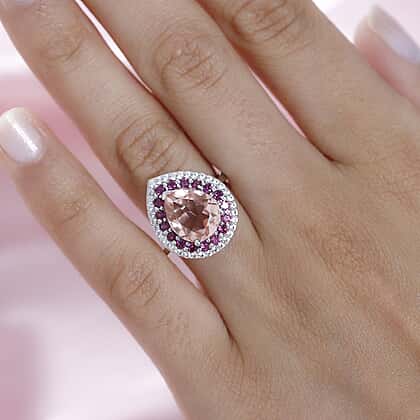 Morganite Triplet Quartz, White Zircon, Lotus Garnet Double Halo Ring in Platinum Overlay Sterling Silver 4.941 Ct
