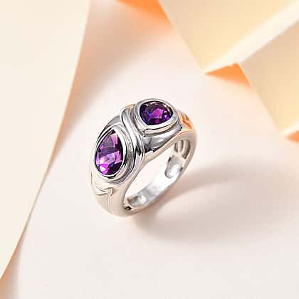 Capture the mystique of Moroccan nights with this enchanting Amethyst Ring. Two deep purple amethysts are set in sleek platinum overlay sterling silver, offering a regal and sophisticated air. This ring is a treasure that brings a touch of exotic flair to your jewellery collection. The rich purple hues and captivating brilliance of the amethyst are sure to turn heads, making this ring a unique and unforgettable statement piece.