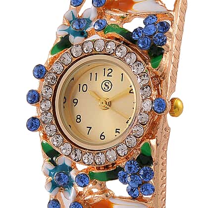 This exquisite STRADA bangle watch is a harmonious blend of utility, design, and craftsmanship, perfect for the modern trendsetter. Featuring a stunning gold-plated alloy case adorned with sparkling white crystals, the watch doubles as a dazzling accessory. The bracelet's vibrant multi-colour enamel and rose glass accents reflect meticulous craftsmanship, making it a standout piece for any occasion. It combines practicality with elegance and is powered by reliable PC21S Japanese Movement and a water-resistant design. The sunshine gold dial with black numerals ensures clear readability while enhancing its timeless charm.